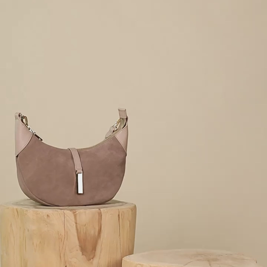 Laura Shoulder Bag designed in a refined crescent silhouette. Crafted with a smooth blend of materials, it features a structured top strap, polished metal accent, and a secure zip closure. The compact yet functional interior offers easy organization for your essentials, making it the ideal companion for both casual outings and polished occasions. A stylish balance of sophistication and practicality.